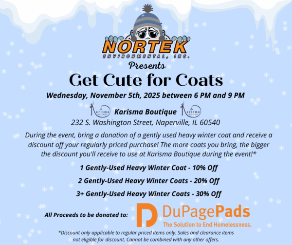 Join Nortek Environmental and Get Cute for Coats! Bring a donation of a gently used heavy winter coat and receive a discount off your regularly priced purchase! The more coats you bring, the bigger discount you’ll receive to use at Karisma Boutique during the event!*